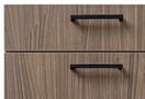 Akoni Wood Nachbildung AFP UV Lack matt Struktur: warme Holzoptik, samtige Haptik, pflegeleichte Oberfläche. Onyxschwarz matt Lacklaminat: moderner Kontrast, ruhige Wirkung, zeitloser Stil. Onyxschwarz Struktur auf der Arbeitsplatte: robuste Basis, edler Look, angenehmes Arbeiten. Bügelgriffe: sicherer Griff, klare Orientierung, komfortables Öffnen.