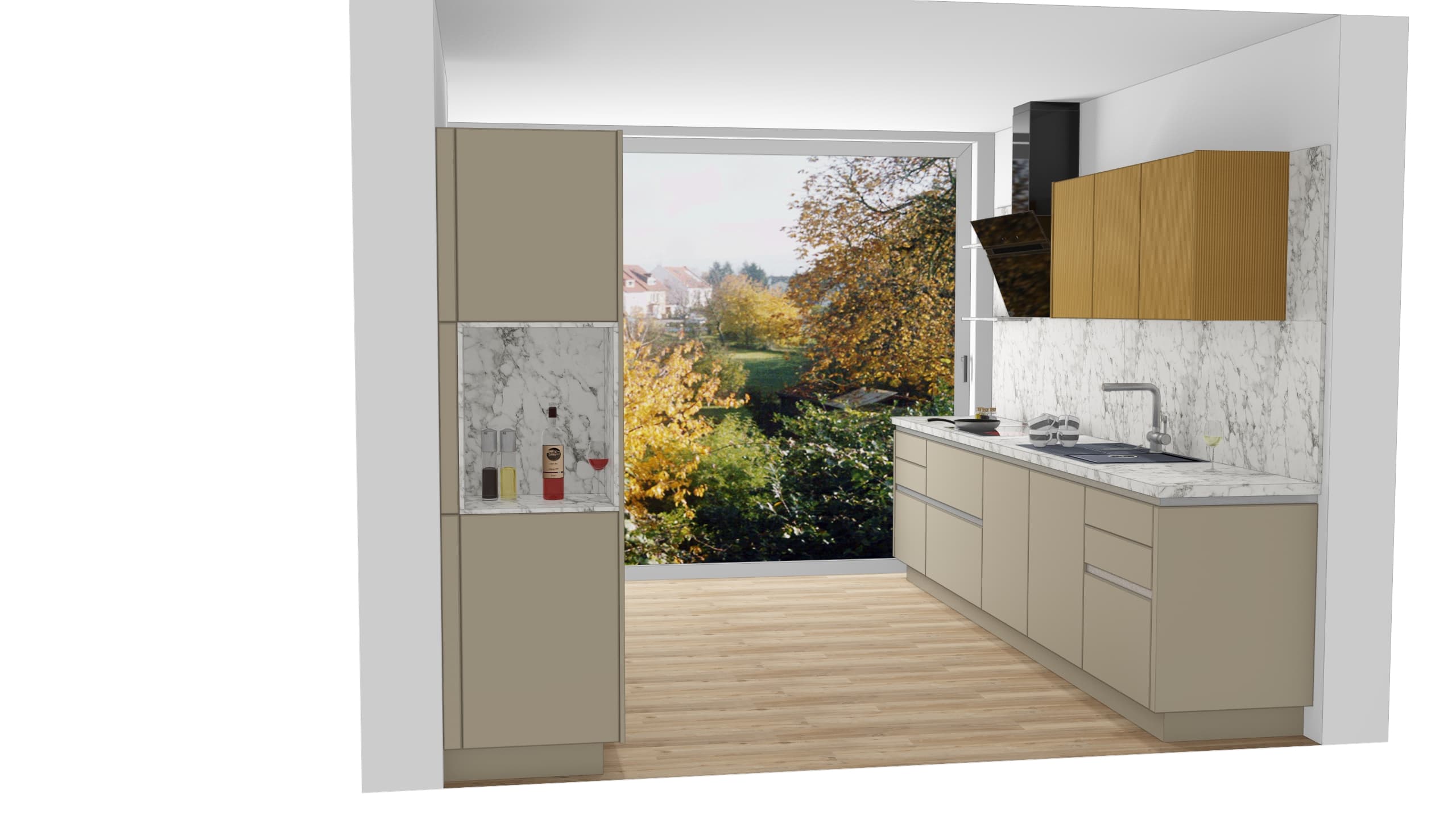 Hängeschränke Zwei Oberschränke mit Drehtüren: Nutzen Sie den Raum über der Arbeitsfläche effizient für Geschirr und Gläser, die Sie täglich benötigen.