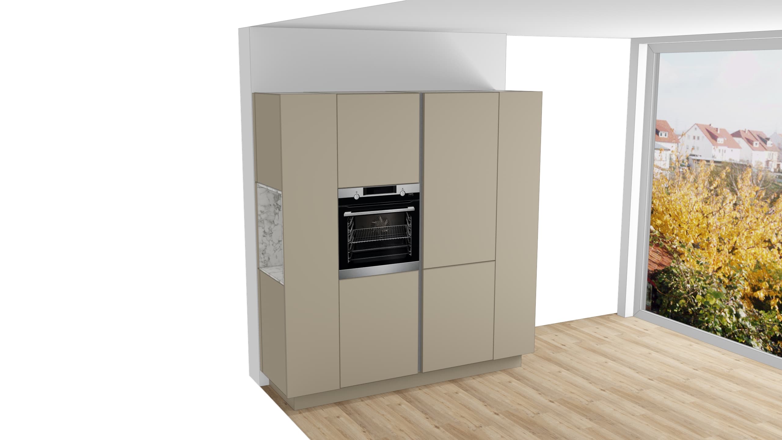 Edle Optik und Robustheit im Alltag garantieren Ihnen die Arbeitsplatte sowie die Nischenrückwand in heller Marmor Nachbildung. Minimalistisches Design bringt Ruhe in Ihr Zuhause, denn die schlichte Front mit Griffmulden in Edelstahloptik und Push to open Funktion sorgt für eine nahezu grifflose Ästhetik und erleichtert Ihnen die Reinigung. Nutzen Sie dank der cleveren Planung als Singleküche mit Zeile und separatem Modul auch begrenzten Platz optimal aus. Rückenfreundliche Bedienung bietet Ihnen der hochgebaute Backofen, damit Sie Ihre Speisen stets bequem im Blick haben. Für Ihre perfekte Haltung sorgen die Höhe des Sockels von ca. 12 cm und die Höhe der Arbeitsplatte von ca. 91 cm, wobei sich diese Maße selbstverständlich auch individuell an Ihre Körpergröße anpassen lassen.
