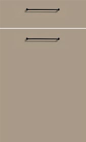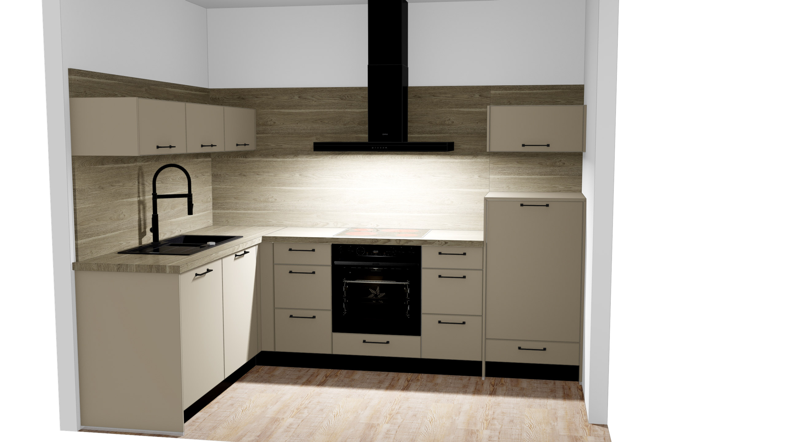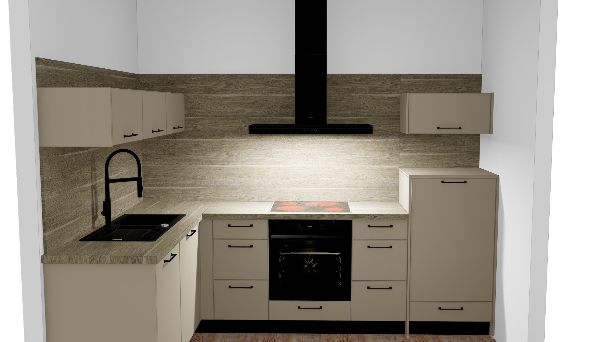 Die Fronten in Cremegrau supermatt mit UV-Lack und die Arbeitsplatte sowie Nischenrückwand in Eiche braungrau harmonieren perfekt miteinander und verleihen Ihrer Küche eine moderne, puristische Ästhetik. Die durchgängigen Fronten und die schlichten, schwarzen Metallgriffe in horizontaler Anordnung unterstreichen das elegante Design, während die matten Oberflächen für eine zeitlose Eleganz sorgen.