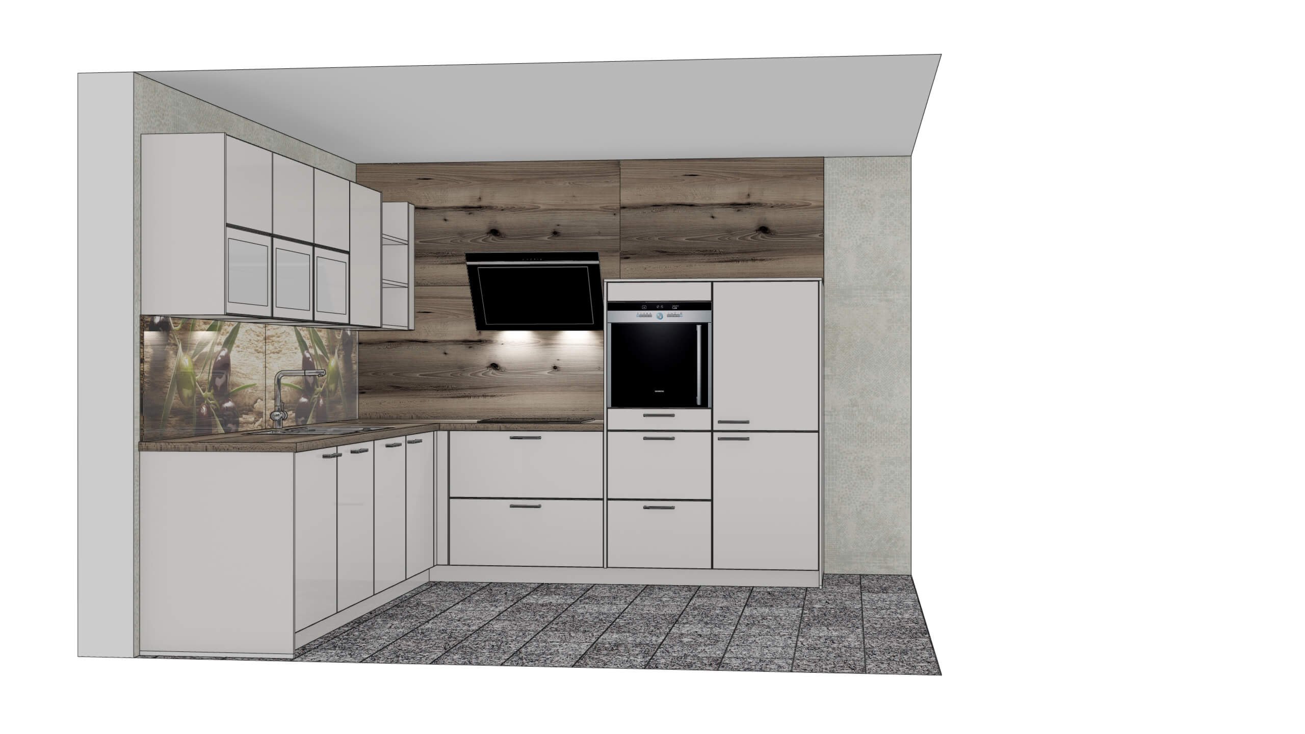 Entdecken Sie die moderne Trendküche Gala von Schüller! Diese L-förmige Küche imponiert mit ihrer eleganten muschelweißen Frontfarbe in Hochglanz, die jedem Raum Licht und Frische verleiht. Die Arbeitsplatte und die Nischenrückwand in Virginia Eiche Nachbildung harmonieren perfekt mit den schwarzen Bügelgriffen und dem dezenten Olivenmotiv, das dem Gesamtbild eine subtile, naturverbundene Eleganz verleiht.