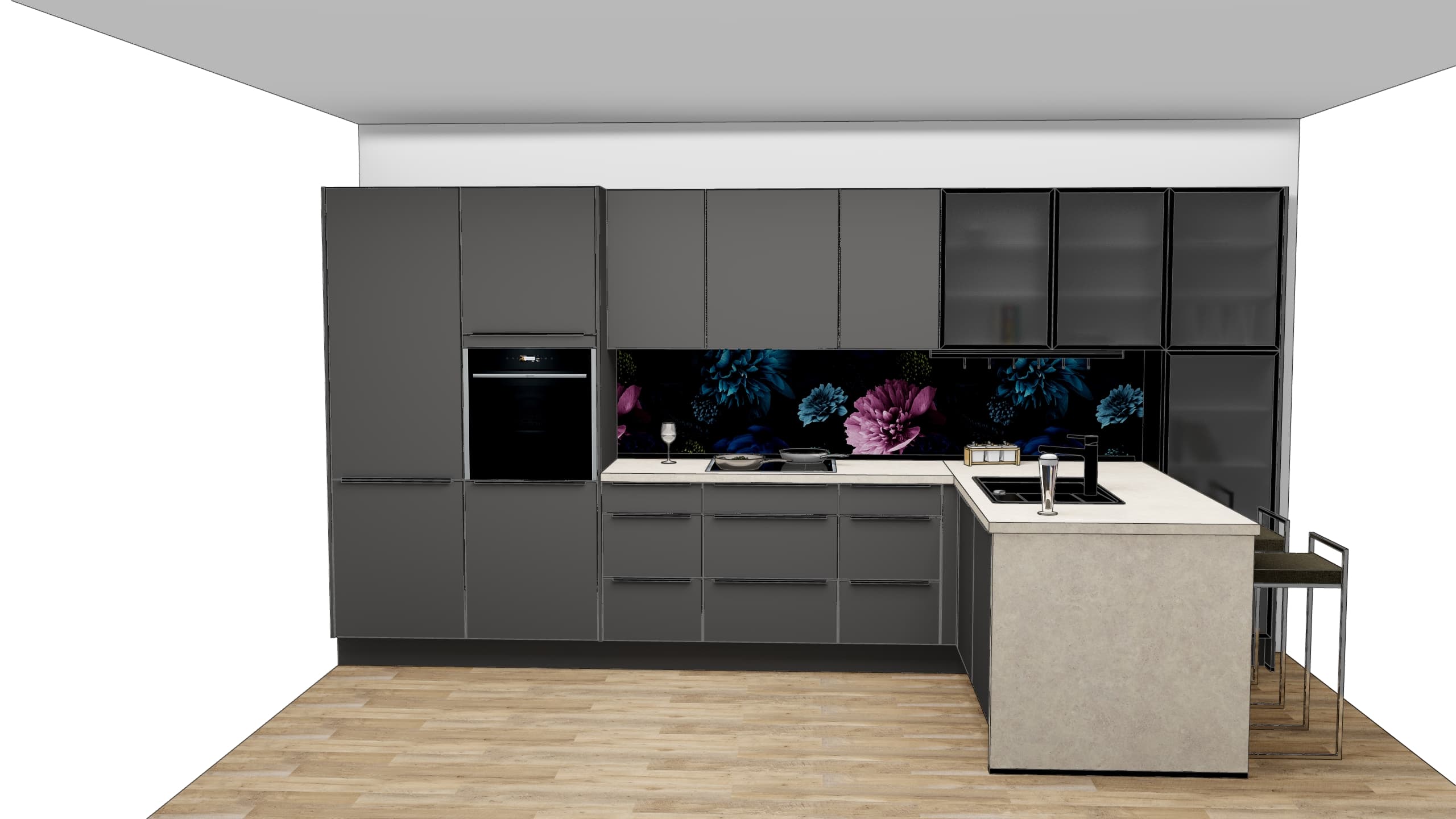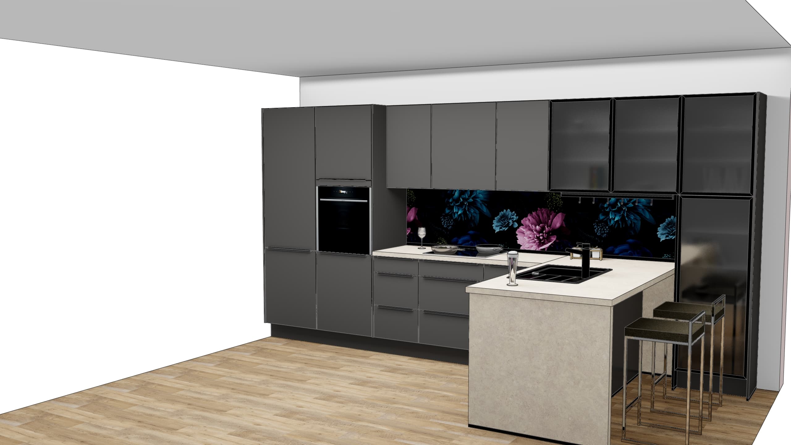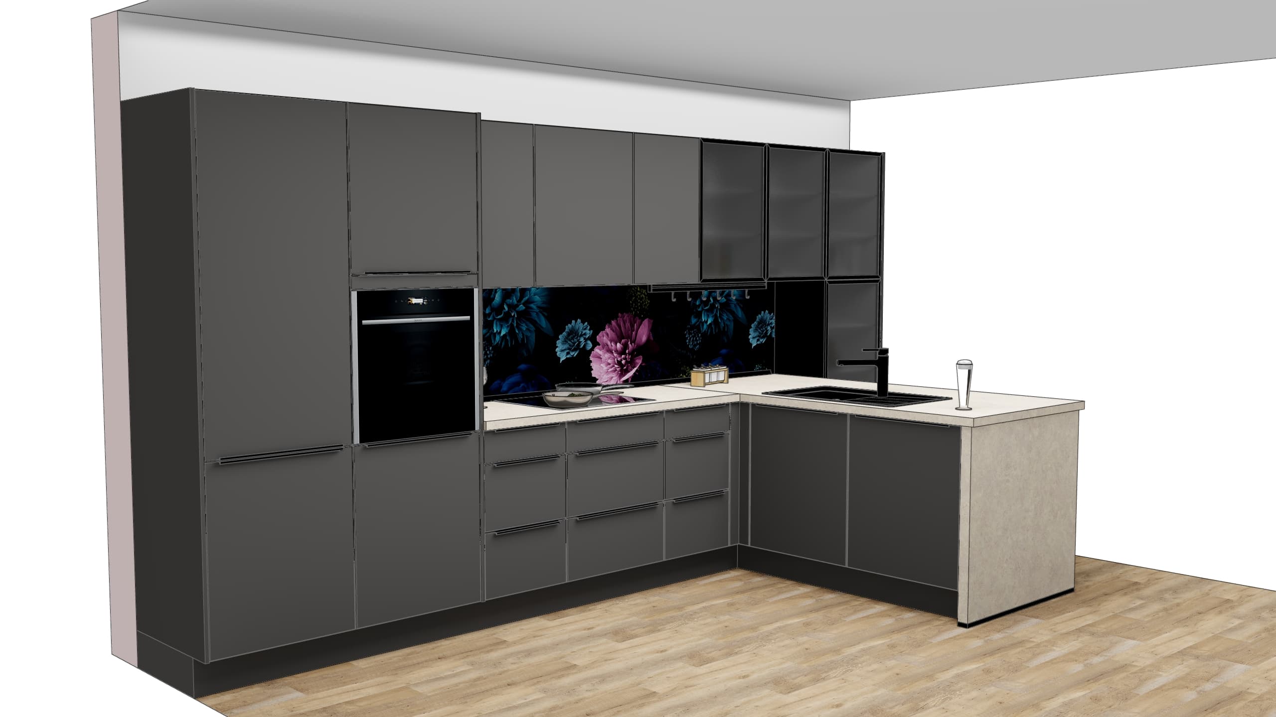 Erleben Sie Ihre Traumküche mit der modernen Trendküche Modell C357 von der Marke Culineo. Diese L-förmige Küche beeindruckt mit schlichten und Hochglanz Fronten in schiefergrau matt Lack und eleganten Schwarzglas-Alu-Rahmenfronten. Die Arbeitsplatte in ansprechender Limestone-Nachbildung und die ästhetische Nischenrückwand im Dekor Flowers setzen stilvolle Akzente.