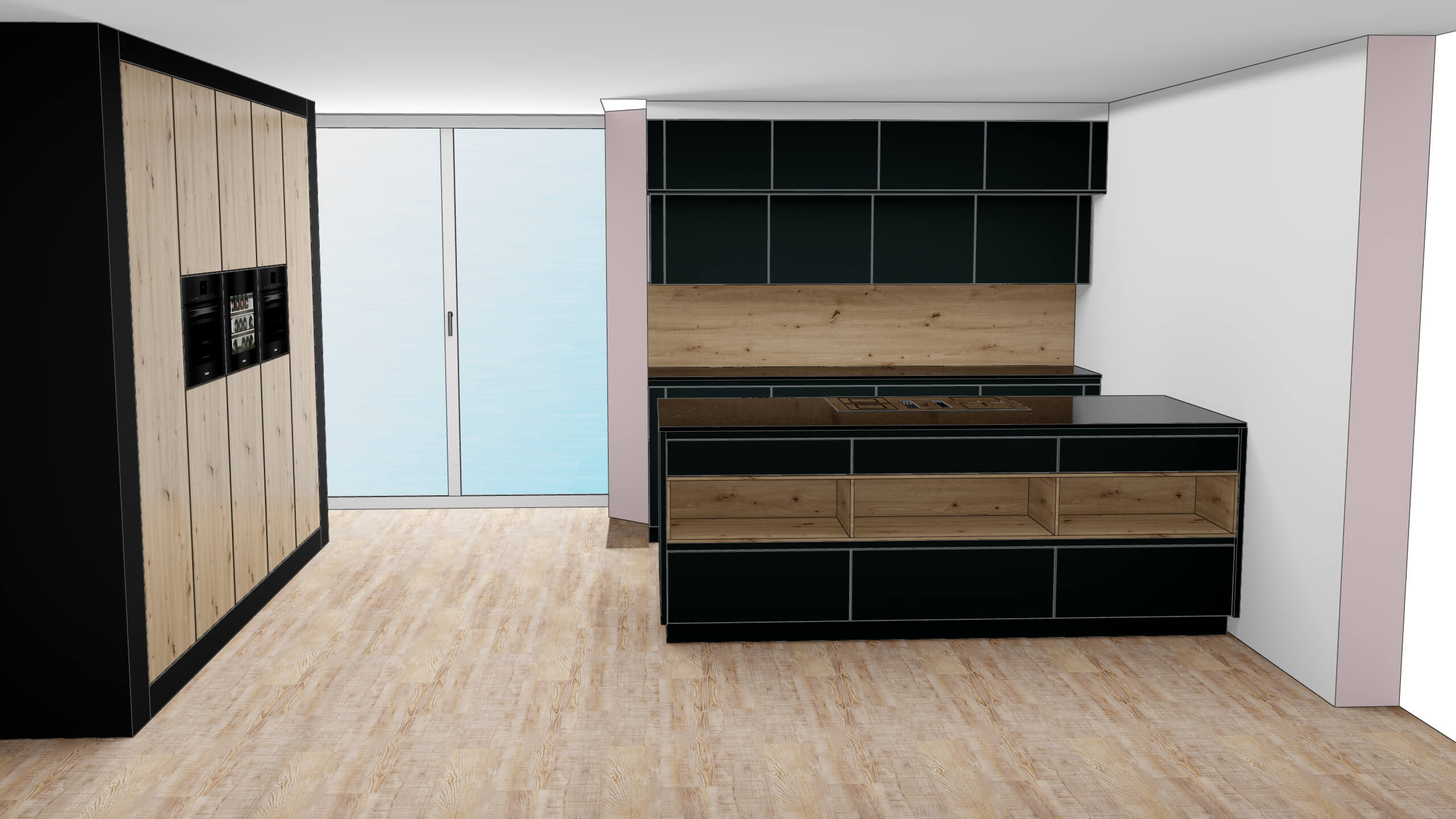 Entdecken Sie die moderne Designküche Modell Fino von Wert Küche, die Eleganz und Funktionalität in perfekter Harmonie vereint. Mit durchgängigen, grifflosen Fronten in stilvollem Lavaschwarz matt - inklusive Anti-Fingerprint-Technologie - strahlt diese Küche zeitlose Schönheit aus. Die warme Wildeiche Natur Nachbildung an Nischenrückwand und Absetzungen setzt stimmige Akzente.