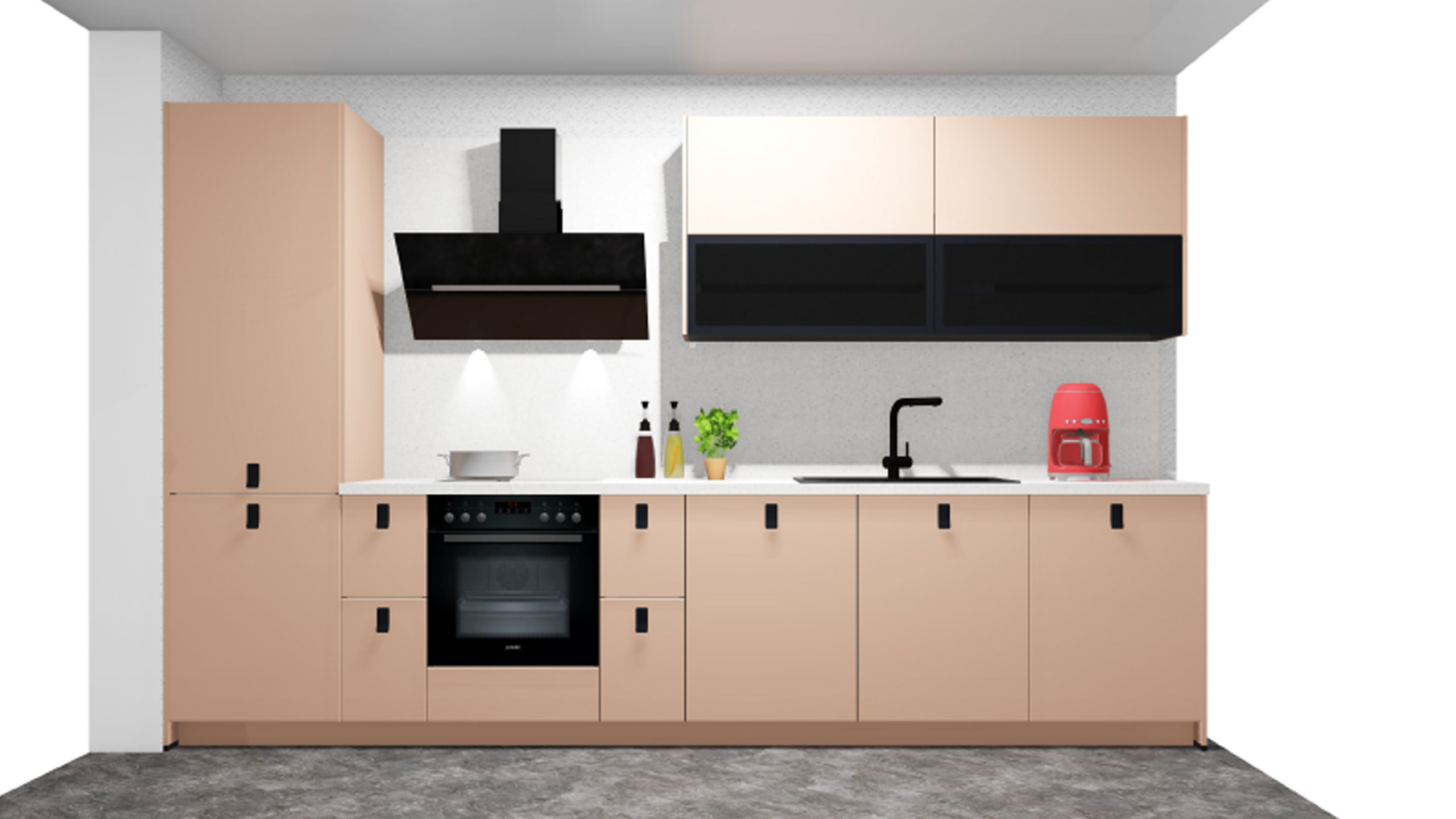 Dank der ergonomischen Planung finden Sie in dieser Singleküche nicht nur ausreichend Platz, sondern auch optimalen Komfort. Die Arbeitsplatte in ca. 93 cm Höhe und ein Sockel von etwa 10 cm lassen sich in der Planung auch an Ihre individuellen Bedürfnisse anpassen. Matte Oberflächen und schwarze Rahmen mit gefärbtem Glas im Industriestil schaffen eine angenehme Atmosphäre, während die grifflose Front bereits jetzt für ein modernes Wohngefühl sorgt.