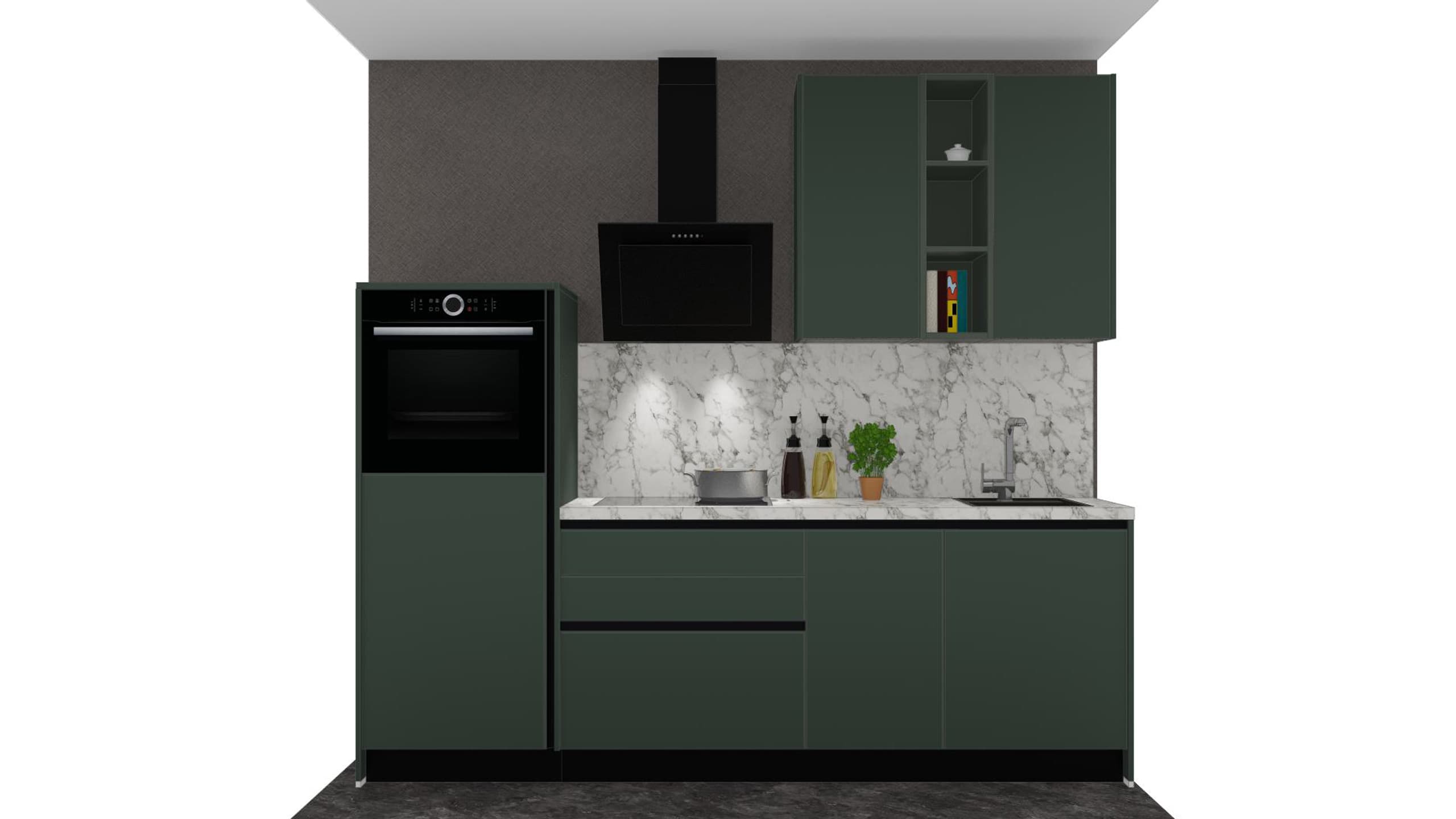 Entdecken Sie bei Möbel und Küchen Berning eine Komposition, die Ihren Alltag verschönert. Das Modell Clean von der Marke Express präsentiert sich als stilvolles Highlight für Ihr Zuhause. Besonders edel wirkt die Front in UV-Lack Dunkelgrün supermatt: Diese samtige Oberfläche strahlt eine moderne Ruhe aus und fühlt sich angenehm weich an. Einen frischen Kontrast bildet die Arbeitsplatte in Marmor hell: Sie bringt Licht in den Raum und harmoniert perfekt mit der gleichfarbigen Nischenrückwand.