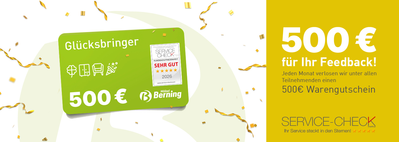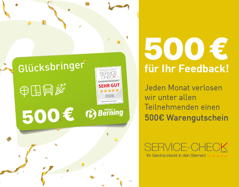 Bei Möbel Berning steht Ihre Zufriedenheit an erster Stelle. Um unseren Service kontinuierlich zu verbessern, haben wir seit dem 1. August 2024 das renommierte Institut "Service-Check" damit beauftragt die Kundenzufriedenheit für unsere Standorte Lingen und Rheine anonym zu messen. Nach jeder Lieferung haben Sie als Kunde die Möglichkeit uns Ihr wertvolles Feedback zu Ihrer Berning Erfahrung mitzuteilen.